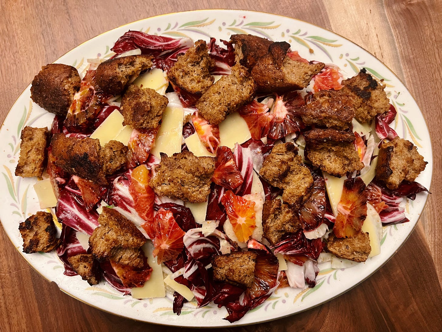 My favorite winter salad. Brightens up any rich, heavy meal. Toss some torn up pieces of bread in a mix of honey, dijon, olive oil, salt, and pepper, and toast in the oven until crunchy. Tear up a head of radicchio and thinly slice a fennel bulb. Slice two oranges (I like to use one cara cara and one blood orange for color, but this doesn’t actually matter) into bite-sized pieces, and thinly slice as much comté or manchego as your heart desires. Toss all of this together with a dressing made of more honey, olive oil, salt, pepper, and dijon (I like a mix of coarse and smooth, but whichever you have handy works). Enjoy!